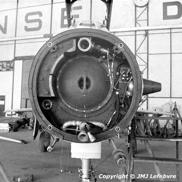 Ha Ha !! Without radome, antenna and electronic compartment , the picture embodies a complete Mirage III B...The center of the center is not a Champagne cork providing the double bang when the aircraft is sonic...but the pressurization cap of cockpit. The right protuberance probably is the basis for various wind probes. Below, on each side, various anemometric probes.