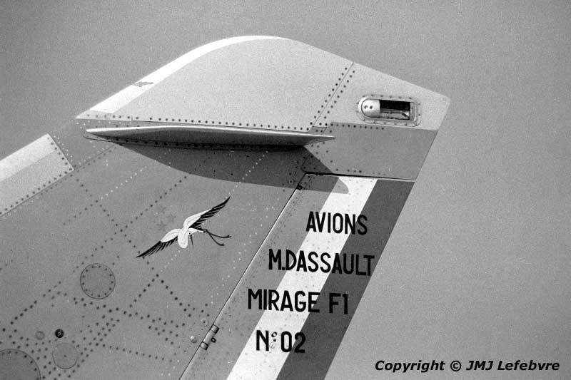 Detail show something more interesting. The four stars above show that the stork is the insigna of a unit headed in the past by the General who, as Armée de l'Air Chief of Staff, flew the single-seat fighter prototype to have an idea of the future material to be introduced. May be the marking of General Gauthier who flew it on April 31, 1970, just a few weeks after this prototype having been reequiped with the latest ATAR 9K-50 with which first flight had been done on February 21 with Jean-Marie Saget at controls, the future Dassault Chief Test Pilot.