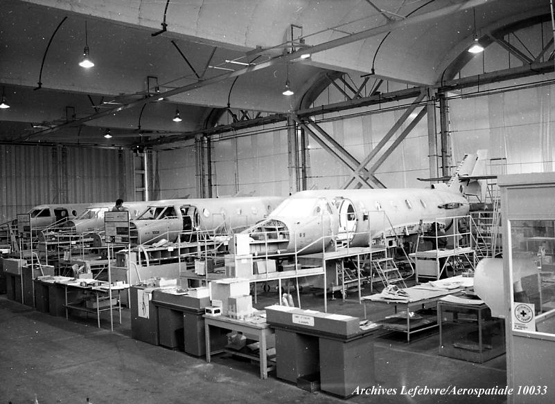 Caption: Il y a du monde en plus à l'assemblage, toujours en mars 1974... Ce qui est intéressant c'est la première cellule marquée A ou R 9, la suivante est la 10 suivie d'une marque 1008 plus grosse et grasse, puis la 11 étant 1009, la suivante est caché par une pancarte. Il aurait été intéressant de savoir si elle était marquée 10010 car celà aurait laissé à penser qu'Aerospatiale était sur des avions de série 100 et envisageait une série 200 pour des appareils allongés ou d'avantage motorisés.