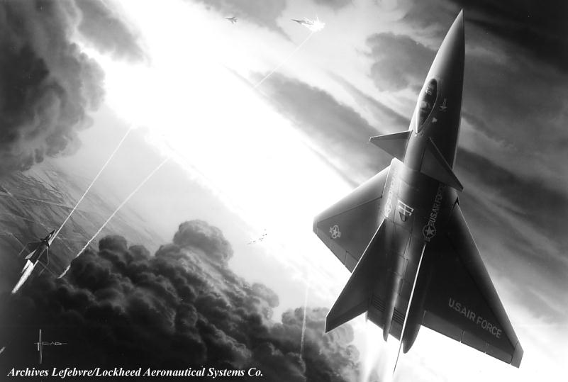Caption: Vue d'artiste de deux Lockheed ATF attaquant des avions ennemis au-dessus d'eux. Ils représentent les technologies avancées de combat à appliquer sur le YF-22 candidat au programme de Chasseur Tactique Avançé (ATF) de l'US Air Force.