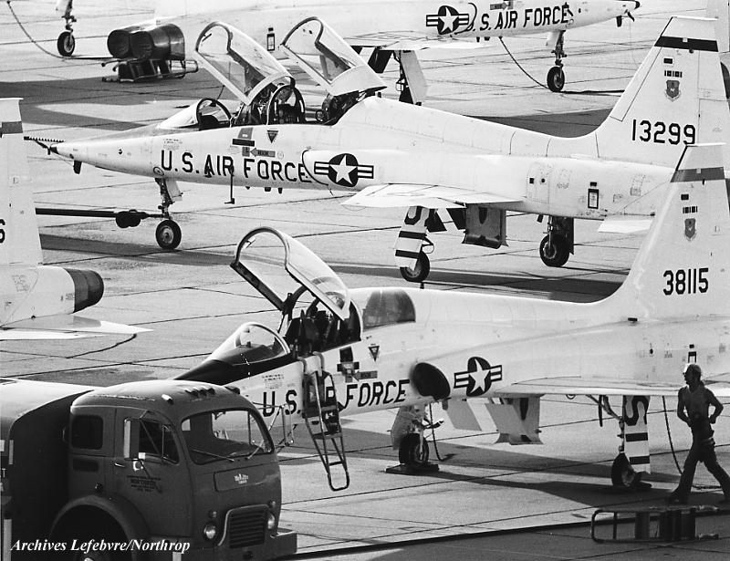 Northrop T-38 de l'USAF Base de Vance, Oklahoma en instance de pleins de carburant effectués par des techniciens de Northrop Worldwide Aircraft Services, firme spécialisée dans la maintenance d'avions et autres services de gestion technique de bases.