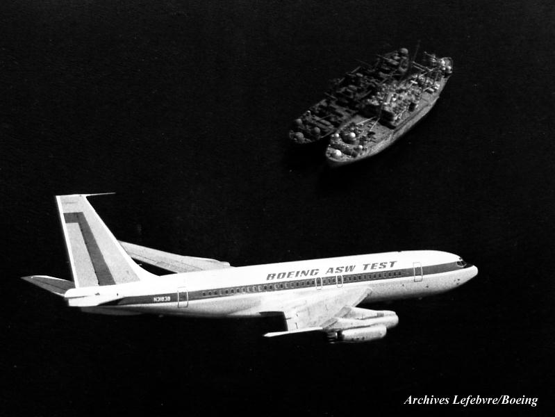 Le 707 N31838 de Boeing réservé aux essais de lutte anti-sous-marine survolant deux navires au-dessus du Puget Sound, Etat de Washington.