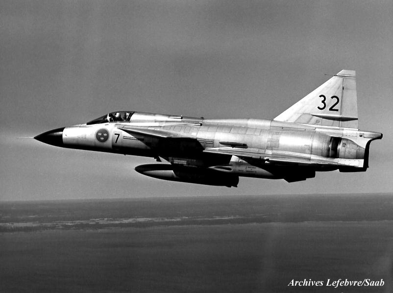 Saab 37 Viggen "7, 32" superesonic multi-purpose STOL combat aircraft.